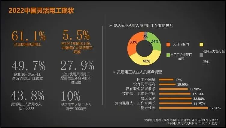 目前中国的就业人口有9.8亿人,灵活用工人数为2.6亿,占总就业人口的20%以上,61.1%的企业在使用灵活用工。灵活用工人员最主要的痛点是稳定性差,四成以上人员的月收入低于5000元。在非正式雇佣方面,国有企业更倾向于劳务派遣和退休返聘,而跨国企业和民营企业则更倾向于录用实习生。