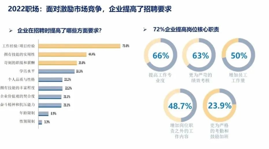 面对激烈的市场竞争,企业对求职者学历水平的要求有所下降,但对工作经验和项目经验的要求上升至第一位,其次是技能的实用性与苛刻的职级和薪酬。同时,企业招聘时对于硬技能的要求趋于严苛,软技能主要看重跨部门的协作能力、抗压能力以及快速学习的能力。疫情后,接近80%的企业不愿提供培训,或对成熟职场人而言并不是坏消息。