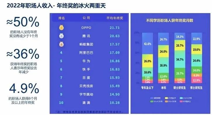 2022年3月个人所得税同比下降51.3%,是疫情三年来个税收入的最低点,代表目前整体收入的下降。2022年近半成的职场人没有年终奖或少于一个月。年终奖整体与学历息息相关,硕士在年终奖1-3个月中占比最高,高于博士生。