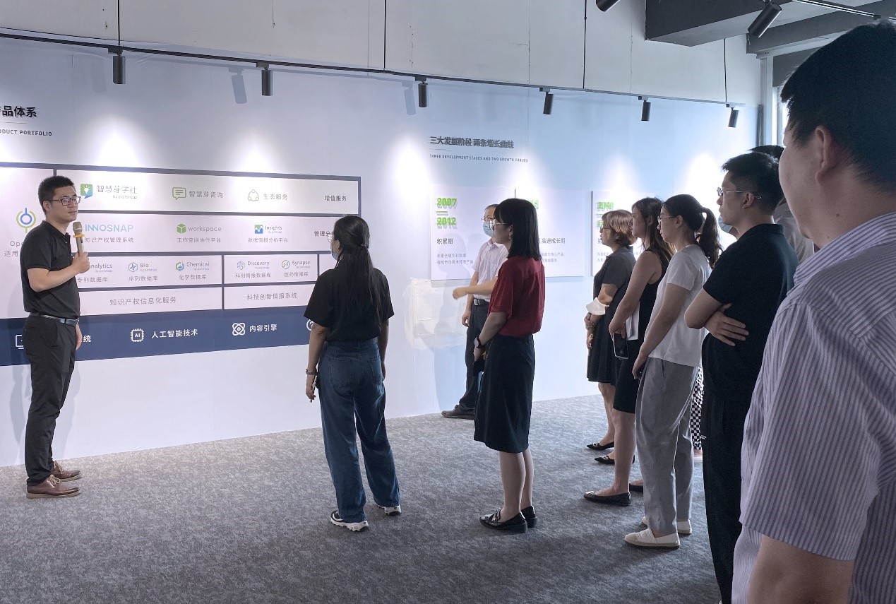 参访过程中,智慧芽战略合作部总监张海华首先带领同学们参观了企业文化长廊,详细介绍了智慧芽的发展历程。智慧芽特有的科创数智平台,深深的吸引了同学们的注意力,看似只是一个展示面板,但跳动的统计数字背后,是科技和智慧的力量。
