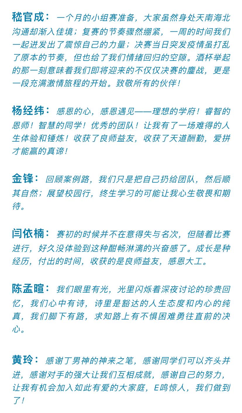 从陌生到熟悉,只需要两个案例,如果说半决赛的案例给了我们磨合期,那么决赛的案例就可以说成是自然而然的水到渠成,丁永健老师的画龙点睛之笔,以及同学们思路的碰撞,灵感的迸发,我们在输出能量的同时也获取了来自老师与同伴的知识补给,如果有人把这看做一场比赛,我们更愿意将其当做我们步入学堂前的一堂课,虽然这堂课让我们开过大会,熬过大夜,但是大家都乐此不疲,乐在其中。会议室里时常的哄堂大笑,酒桌上情真意切的推心置腹,会后战斗群里不断的思路改进,都为我们奠定了最坚实的情感基础,我们始终带着一个信念,24班,要一路一起携手走下去,不管未来快乐还是更快乐,顺利还是更顺利~这个信念一定伴我们E路同行。