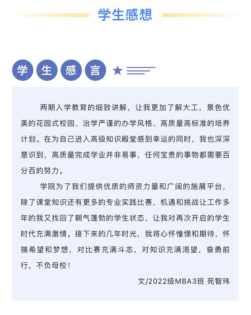 2022级MBA温天宇同学作为2022级新生代表发言,时隔8年再次回到母校,与来自五湖四海的优秀同学们共同深造,深感荣幸。温天宇同学从以己为鉴,认知自我,慎独方能养德;尊师重道,互帮互助,志同方能不孤;坚守初心,矢志不渝,奋斗方能致远三个方面与2022级新生共勉。