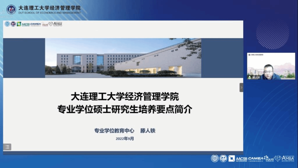 大连理工大学经济管理学院专业学位教育中心副主任、MBA项目部主任滕人轶老师从教学培养、专业实践方面、学生活动及信息与服务平台四个方面为同学们详细讲解了专业学位硕士研究生的培养要点。滕老师着重介绍了学籍管理、学业年限、论文选题及撰写等,使2022级新生对专业学位教育的各个阶段有了全面了解。