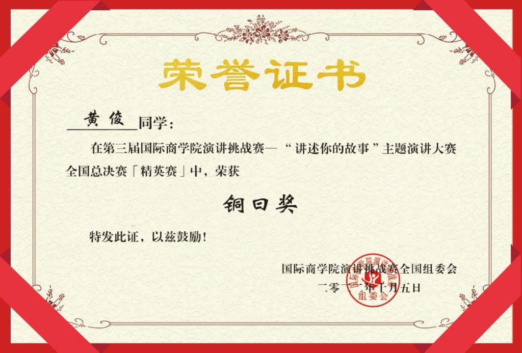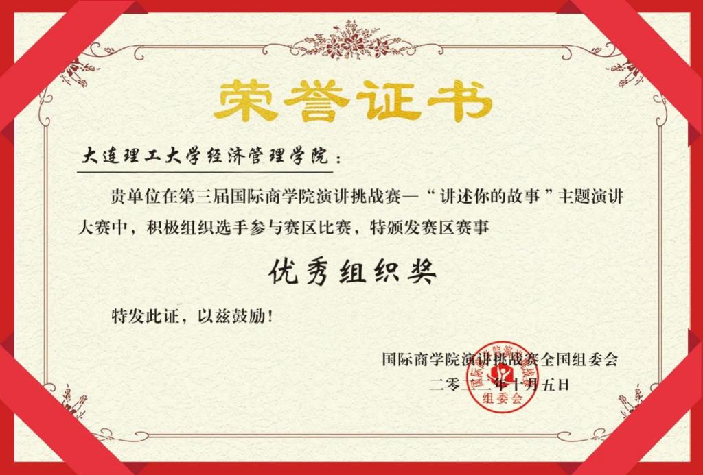 喜报传来!恭喜大连理工大学2020级MBA 4班黄俊、2021级MBA 3班慕佳宏在第三届国际商学院演讲挑战赛全国总决赛中取得佳绩!其中,黄俊同学取得“铜曰奖”,慕佳宏同学取得“子曰奖”,我校获得赛区赛事优秀组织奖获奖。