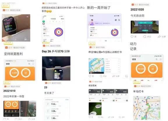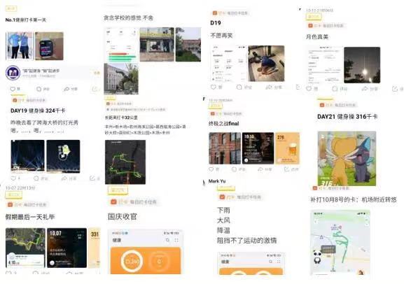 本次活动共有172位同学参加,参与者运动时使用运动APP进行记录,提交每日运动记录,例如健身照片、健身短视频等进行云打卡。有55位同学在活动期间打卡满14天,31位同学打卡满21天,打卡最多者连续打卡25天共消耗19082千卡能量。活动还吸引了苏州、深圳、沈阳等地区的同学们,大家纷纷在云打卡平台打卡圈中进行点赞互动交流,以“热量”会友。打卡圈不仅成为了大家每日进行健身打卡的“监督台”,还成为了一些同学记录分享生活趣味的“记事本”。