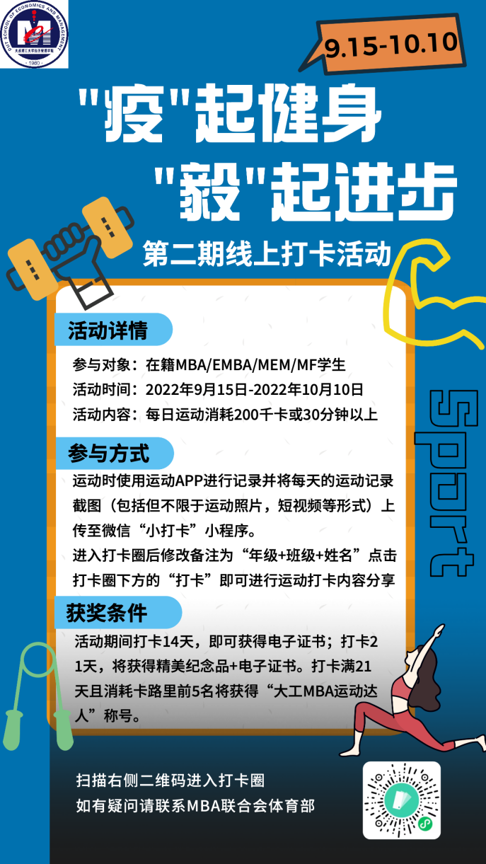 金秋十月,秋色宜人。为了丰富大工MBA同学们的课余生活,倡导同学们养成坚持锻炼的好习惯,营造健康生活高效学习的氛围,MBA联合会体育部举办了为期25天的居家健身打卡活动。