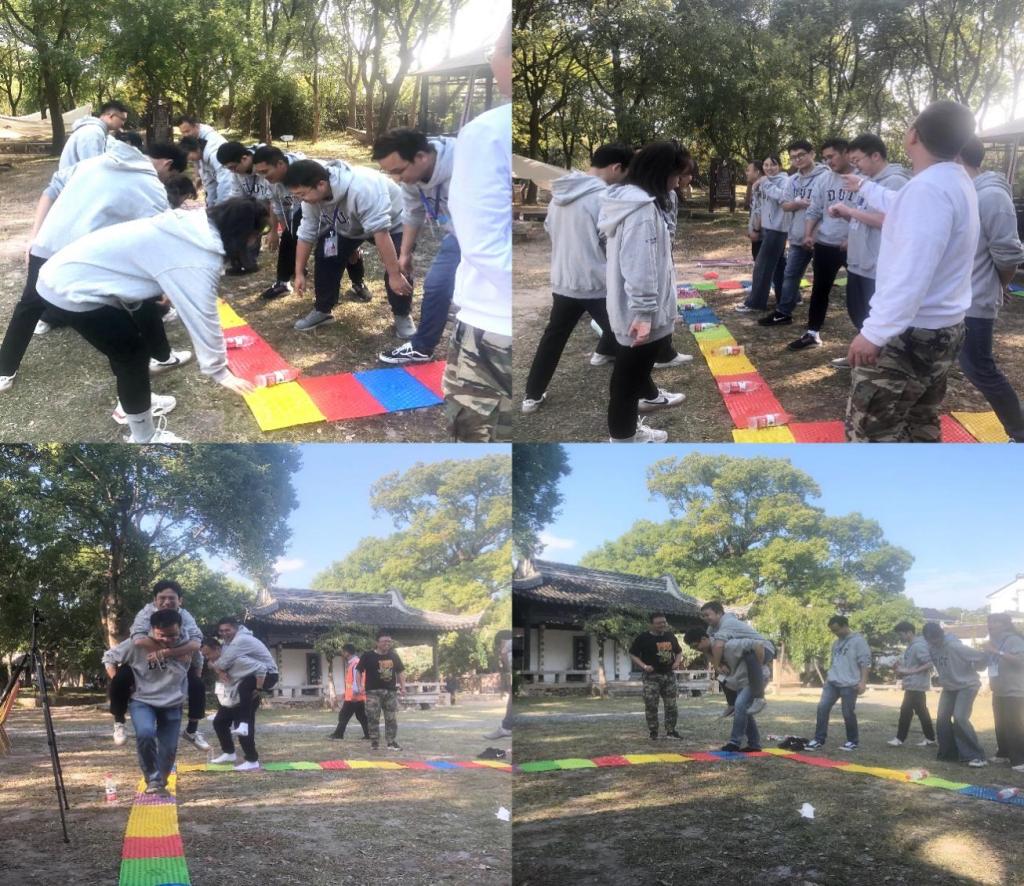 整个下午的户外素质拓展团队被分为两大组开展活动,并开展了以下三个内容:水瓶连线、指压板pk、攻防箭对战。