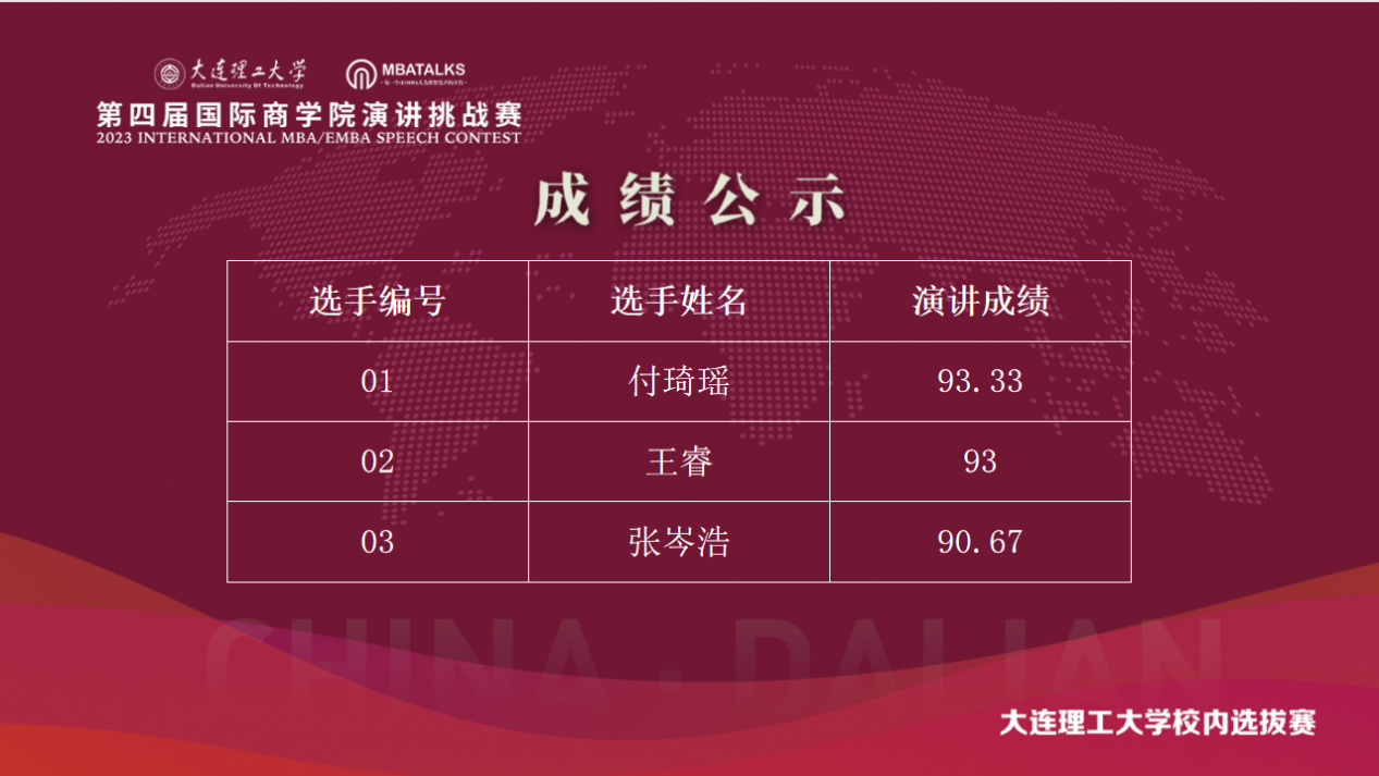 本次报名选手来自大工MBA2021级、2022级两届,共有9名选手参与比赛,经过激烈的角逐,来自2021级MBA付琦瑶获得本次比赛第一名,来自2022级MBA王睿获得本次比赛第二名,来自2022级MBA张岑浩获得本次比赛第三名。这三名同学将代表大工MBA参加第四届国演赛东北赛区比赛,东北赛区比赛将于7月16日在东北财经大学礼堂进行决赛,提前预祝各位选手代表学校赛出好成绩。