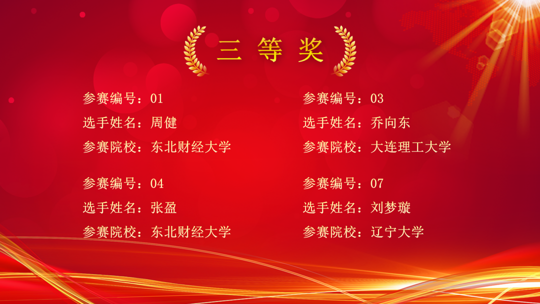 团队荣誉奖项获奖名单:第一名:大连理工大学;第二名:东北财经大学;第三名:辽宁大学