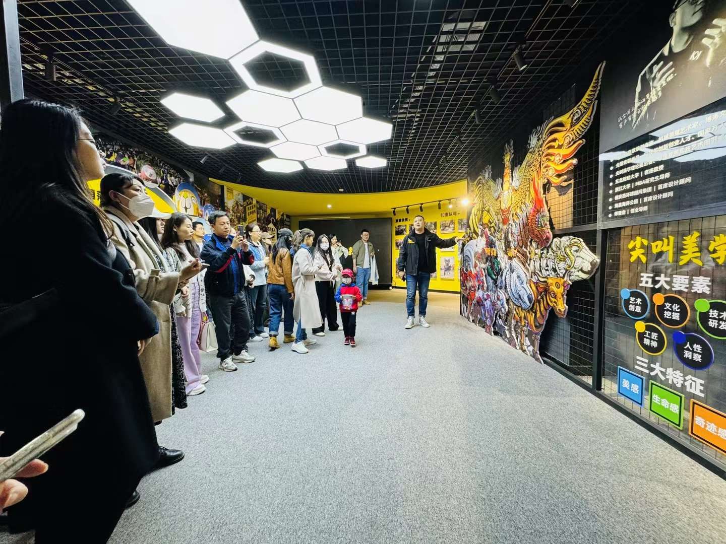 在博涛文化商务总监的热情接待下,我们参观了公司的数字展厅、组装工厂和巨型仿生艺术装置——动能虎和金钱豹。展厅中,那些充满创意的文旅项目介绍、高科技文化装备介绍、巨型仿生机械艺术装置模型等,让我们大开眼界,深刻感受到了科技、文化与艺术的完美结合,博涛文化以中国传统文化为根基通过创新的呈现方式向世界讲述中国故事。博涛文化本部的参观更是让我们对博涛文化的研发实力、创新能力和业内影响力刮目相看,博涛文化不仅拥有一百余项技术专利,还有着一支充满激情和创造力的团队。大连近年的经典地标“熊洞街—巨熊北北”、春晚的“金色巨牛”、达沃斯亮相的“机械巨兽—中华巨马”等等皆出自于此。