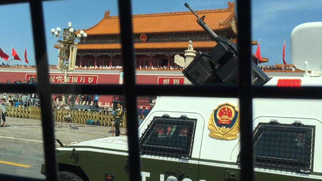 和以往多次参加本部门大型报道项目不同,九三阅兵是我真正意义上参加的举新闻中心多部门之力,共同作战的第一次“大型战役”,而没想到在这第一站中,我又扮演了一名“特种兵”。与回京之前了解到的天安门“核心区”直播单边点位不同,加入“月饼”(出于保密要求,新闻中心节目系统的暗号)后,得知自己要干一件之前历次阅兵中从未尝试过的事——“移动直播”。具体说,就是在要登上受阅的装甲车边走边直播(此举源于今年法国阅兵中的一次创新,一次对于独特的第一视角的直播呈现)。
