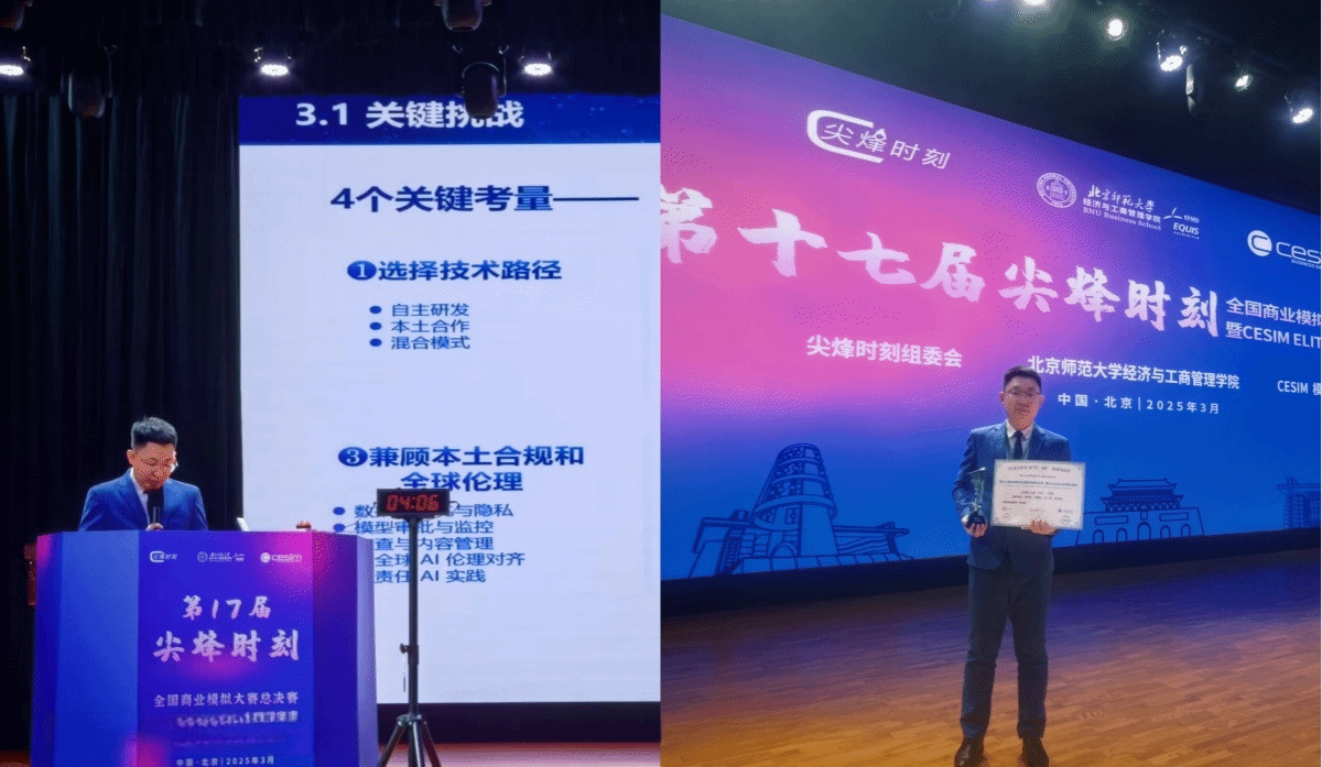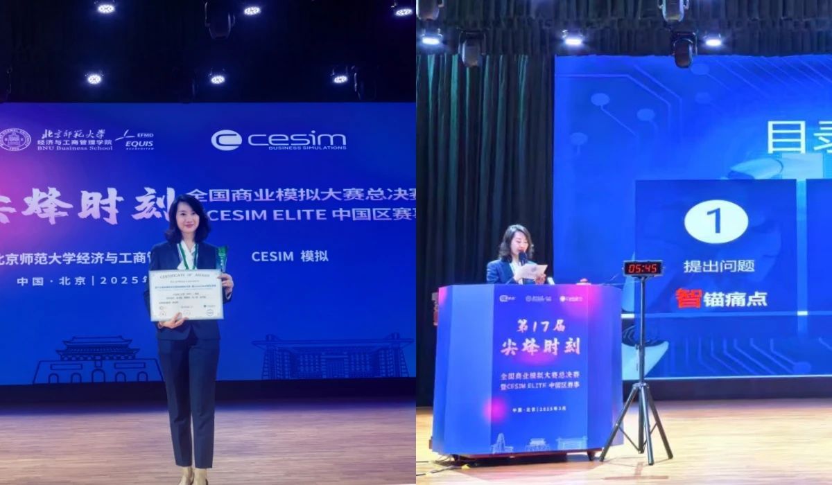 2025年3月28日至30日,第十七届"尖烽时刻"全国商业模拟大赛总决赛在北京师范大学隆重举行。在这场汇聚了全国高校精英的智慧巅峰对决中,我校代表队"GMT"以出色的商业洞察力、创新的战略思维和默契的团队协作,在激烈竞争中脱颖而出,斩获全国一等奖,展现出卓越的商业素养和竞技风采。团队指导教师周英男荣获“优秀指导教师”。
