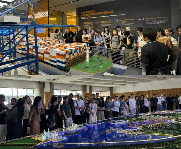 在通过展厅全面了解了港口的发展史和部分作业流程工作原理后,研学团师生来到港口观景平台,远眺无人码头真实作业场景。自动化桥吊、高速轨道吊、智能导引车精准协作,数十吨集装箱如“积木”般轻盈起落、往来穿梭、精准堆码,“中国速度”震撼人心。青岛港集团新闻中心主任焦兰坤全程陪同参访和讲解,为我们细数了青岛港人从自动化码头建设之初到如今推进绿色港口建设进程中始终坚持创新发展理念、锚定科技自立自强的拼搏奋斗史。