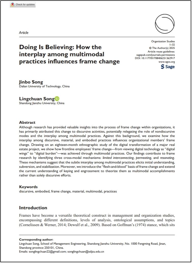 近日,由大连理工大学经济管理学院宋金波教授担任第一作者,山东建筑大学宋凌川讲师作为通讯作者共同撰写的论文“Doing is believing: how the interplay among multimodal practices influences frame change”在国际顶级期刊《Organization Studies》在线发表。《Organization Studies》是组织管理领域顶尖期刊,属于FT 50国际顶级期刊之一。该期刊创刊于1980年,隶属于欧洲组织研究协会(EGOS),在社会科学领域具有广泛的国际影响。