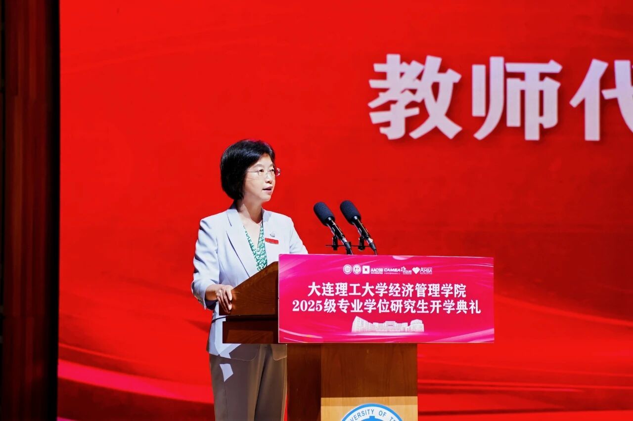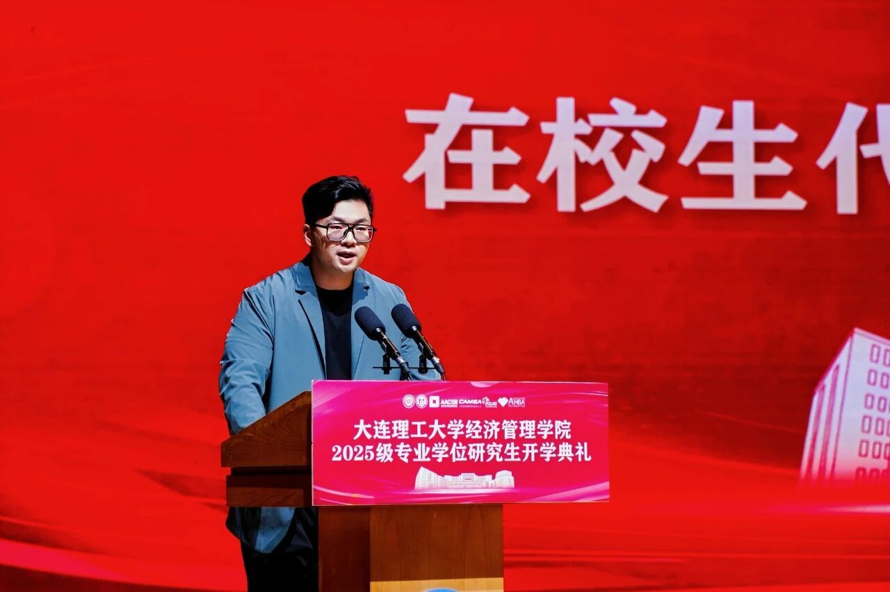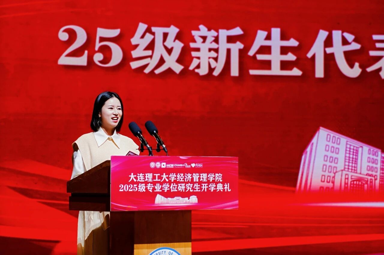 新生代表、2025级EMBA田丽君发言,表达了成为一名“大工人”的激动与自豪,并深情回忆了备考路上的拼搏与坚持。她表示,全体新生将以此为全新的起点,怀揣梦想,不负韶华,在经管学院书写人生的崭新篇章。