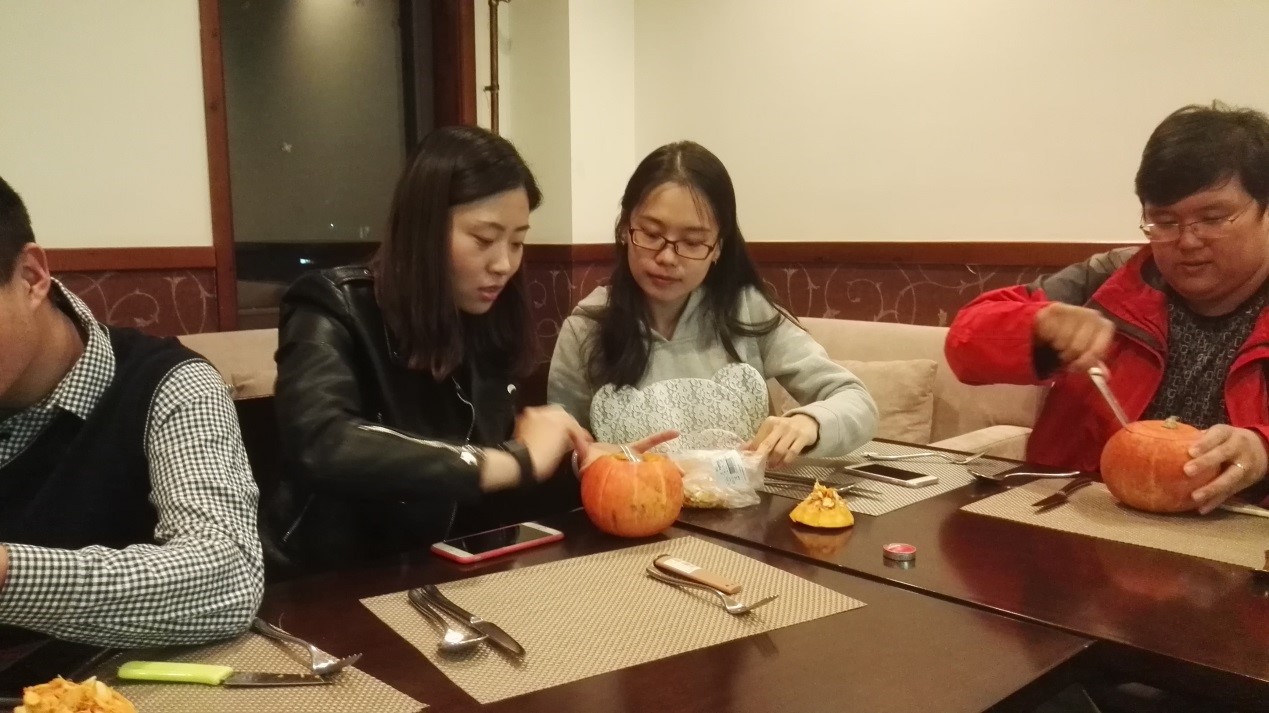 南瓜灯是万圣节最重要的标志之一,其起源于古代爱尔兰,起初人们使用挖空的萝卜制成完胜灯并取名“JACK LANTERNS”,随着历史、文化、宗教的演变,人们最终用南瓜取代了萝卜,这便有了今日万圣节标志物,南瓜灯Jack-O-Lantern。大家两两分组,合力制作南瓜灯。挖空南瓜瓤、画出南瓜灯、镂空南瓜皮、点燃蜡烛……一盏盏南瓜灯在大家共同合作下,精美的呈现在大家面前,倍增万圣节节日风情。