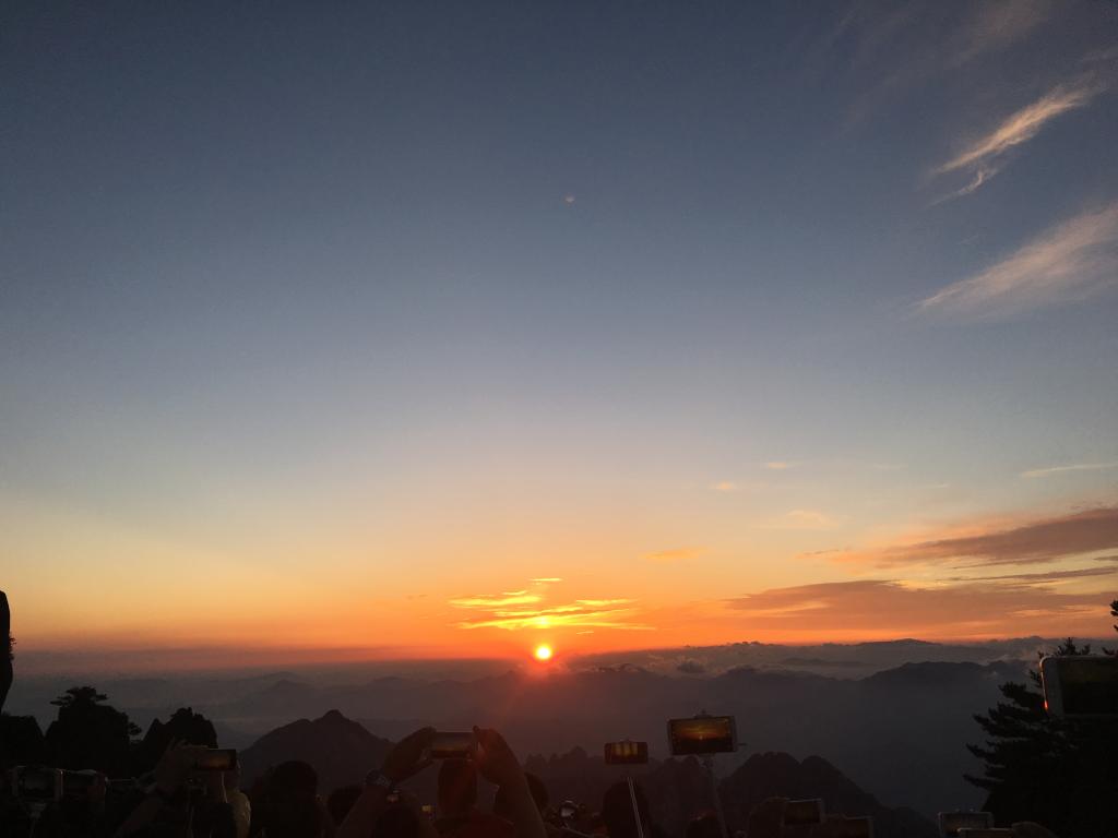 比起泰山的东方既白,黄山的日出显得更为害羞。太阳小姐躲在层层白云之后,半遮半掩,终于在浮云散后露出热情的笑脸。