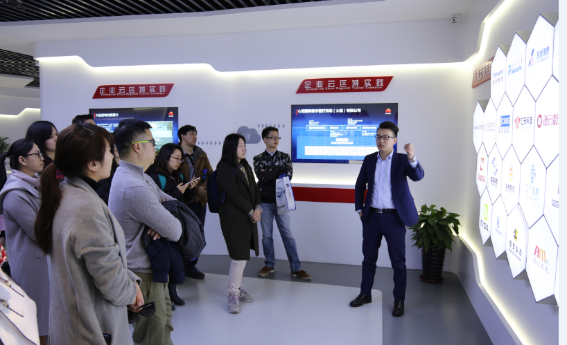 华为大连软件云创新中心位于高新区IC大厦,于2016年3月正式启用,占地1000多平米,目前有开发测试人员近60人。本次MBA学生企业行活动带大家走进华为云,参观华为企业云展厅,近距离展示华为大连软件开发云以及华为企业云和大连本地企业成功实践的案例。