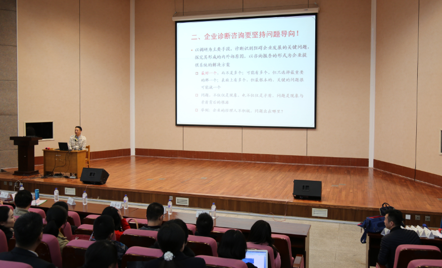 4月9日,丁永健副教授专门在研教楼报告厅为2016级MBA学生做了企业诊断咨询实践课程的专题讲座,他的语言诙谐幽默,案例生动,现场不时发出阵阵笑声,互动中已有跃跃欲试的暗流涌动。