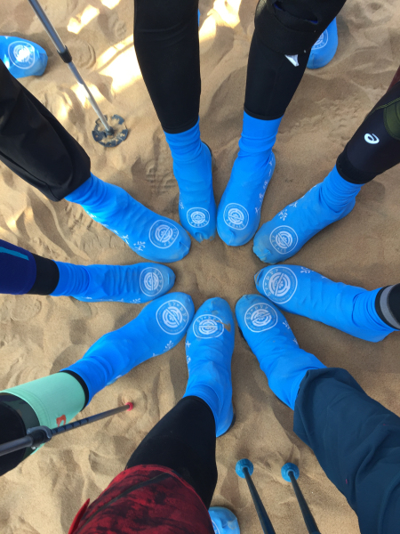 雨中的沙漠气温骤降,队友们决定放弃排队领早饭,用之前所剩的路餐和能量胶进行简单的补给。A队先出发,其他队友留下来帮助A队队员整理帐篷和行李。发令枪响,出发,雨中的路变得泥泞,原本松软的沙子走起来更加挣扎。由于第三个比赛日的总长度只有11公里,所以大部分选手在出发时就选择了全速前进,如果想成功完赛不被“关门”,只能努力跟紧大部队并且找准时机完成超越。