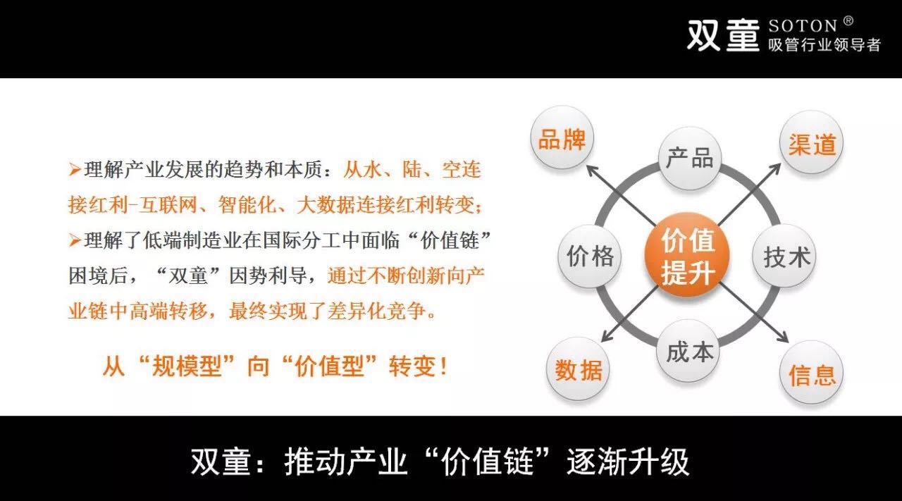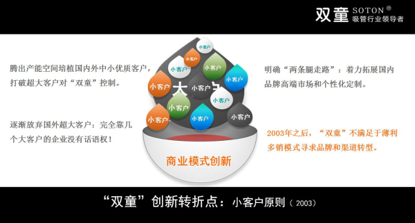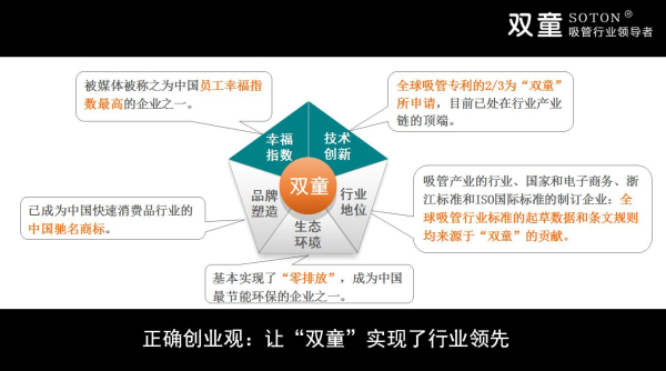 我们看到,“双童”的发展其实就是中国民营企业的发展演变史。江浙一带的民营企业从一开始的简单模仿到今天的创新型发展,这不仅是市场激烈竞争、优胜劣汰的结果,也反映了企业家思维的转变与创新。突破固有思维,打破传统观念,让不起眼的“吸管”也变成了“高大上”,使传统产品焕发了勃勃生机。双童吸管树立了很好的学习榜样,让更多中小企业看到榜样的力量。