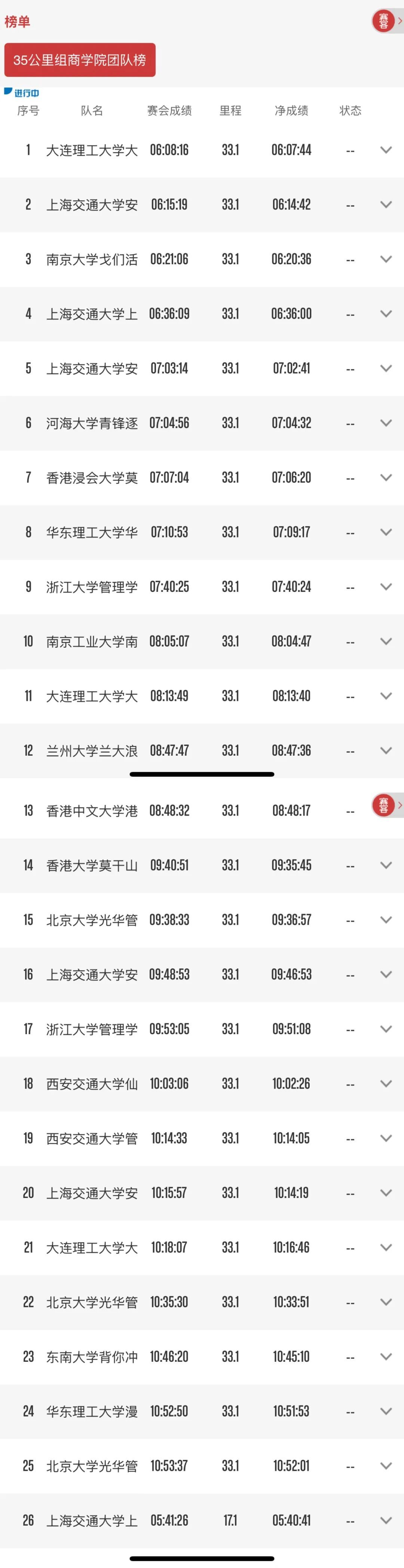在竞争激烈的商学院赛中赛板块,全国67所顶尖商学院、1000余名精英选手齐聚赛场,分别在35km、70km、100km三个组别展开角逐。大连理工大学代表队由39名MBA与EMBA学生共同组成6支队伍,5支队伍冲击35公里团队赛,1支队伍挑战70公里团队赛。