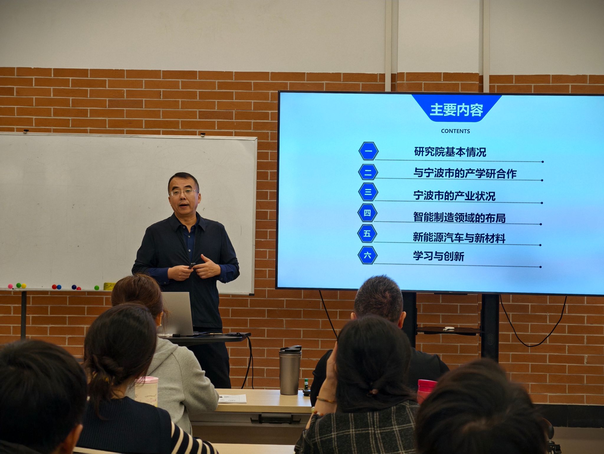 随后,郝院长在“面向前沿技术,集聚创新人才,助推产业发展”的专题讲座中指出,研究院的核心使命是成为高校与区域产业的枢纽。他分析了宁波的产业优势与人才需求,并强调:“创新需要扎根产业土壤,创业则要找准技术与市场的契合点。高校、企业与区域经济的同频共振,是产教融合的精髓所在。”这为同学们搭建了“高校——区域——产业”的宏观认知框架。