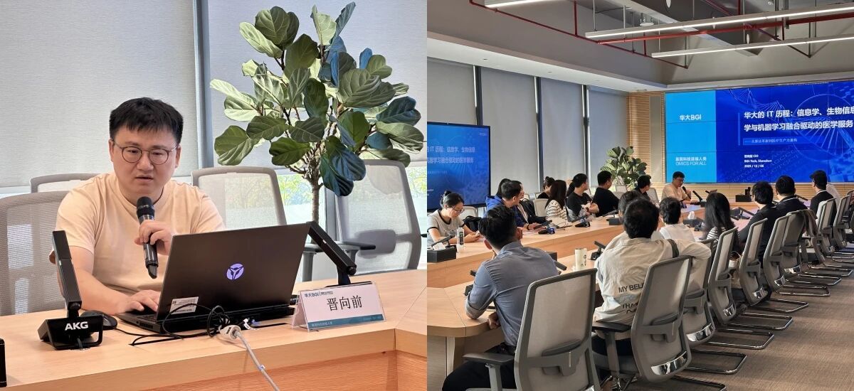 参观结束后,华大集团首席信息官(CIO)晋向前以《华大的IT历程:信息学、生物信息学与机器学习融合驱动的医学服务——从算法革新到医疗生产力重构》为主题,为同学们进行了深度分享。他系统梳理了华大在数字化转型中的关键探索:通过高性能计算技术破解基因组序列拼接难题,运用机器学习赋能肿瘤分析与新药研发,并借助大数据与人工智能重构医疗服务模式。这些技术融合的实际案例,生动阐释了科技创新对企业发展的核心驱动作用。结合华大在数据存储、分析效率提升及跨部门协作等方面的实践,晋总分享的转型经验,为同学们提供了极具价值的行业参考。
