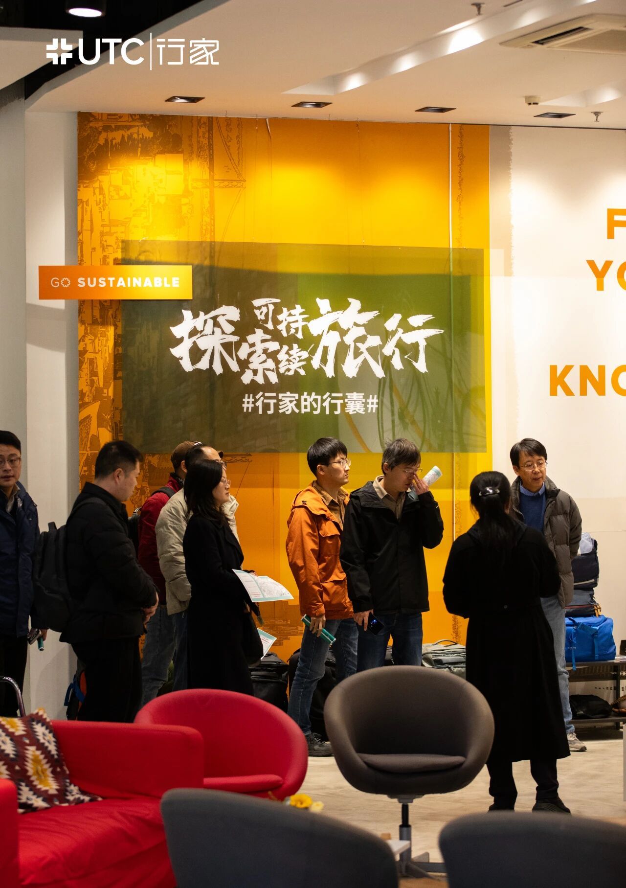 刚踏入UTC行家体验中心,同学们不仅感受到来自UTC行家CEO Amy及其团队的热情,充满活力的空间设计也令人眼前一亮。巨型的 “GO SUSTAINABLE” 立体标识与独木舟装置相呼应,鲜明传递出品牌的可持续理念。墙上悬挂的冲浪板、专业户外背包与各地时区时钟,勾勒出 “探索世界” 的旅行氛围。新春主题的红色装饰与 “马年大吉” 的祝福,更为参访增添了温暖的烟火气。在沉浸式的场景中,同学们直观感受到UTC行家如何将旅行文化、户外装备生产和销售与可持续理念深度融合,也对“旅行不止于行走,更是责任与探索的结合”有了更鲜活的认知。