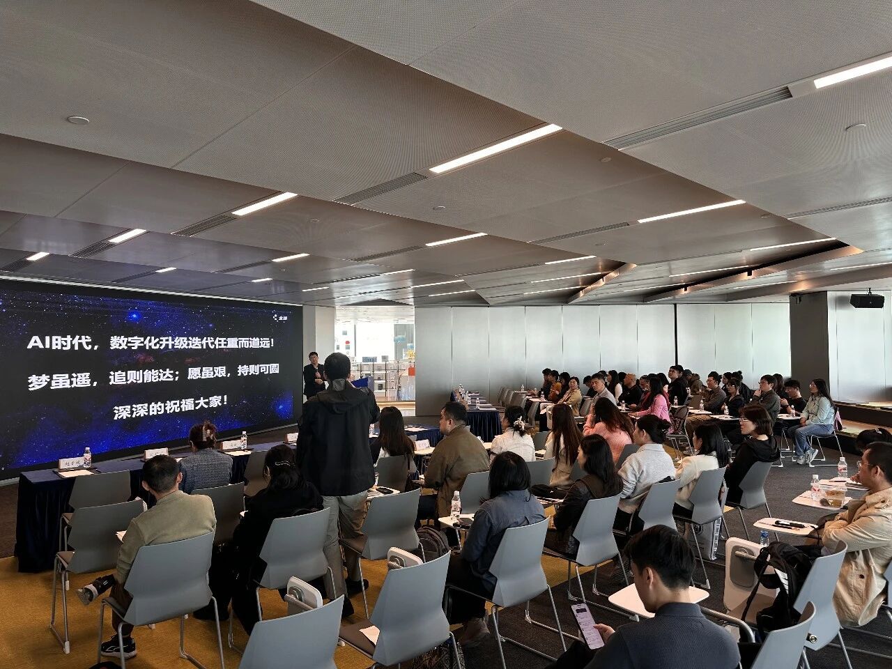 金蝶资深解决方案顾问宋明军为研学团师生带来专题报告,系统介绍了金蝶的发展历程、战略布局、AI产品与解决方案平台建设成果,以及代表性客户的行业应用案例等。师生们深入了解到AI技术在智能财务、人力管理等场景的落地应用,以及金蝶苍穹PaaS平台助力企业实现业财税一体化转型的核心逻辑。交流过程中,师生们深刻感受到,金蝶的发展不仅体现在产品与技术的迭代,更是对“科技赋能管理”理念的深刻践行。