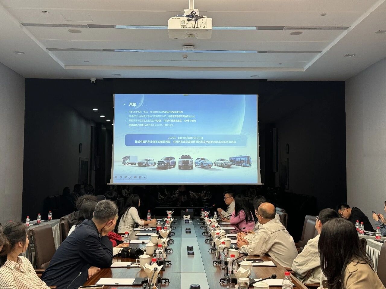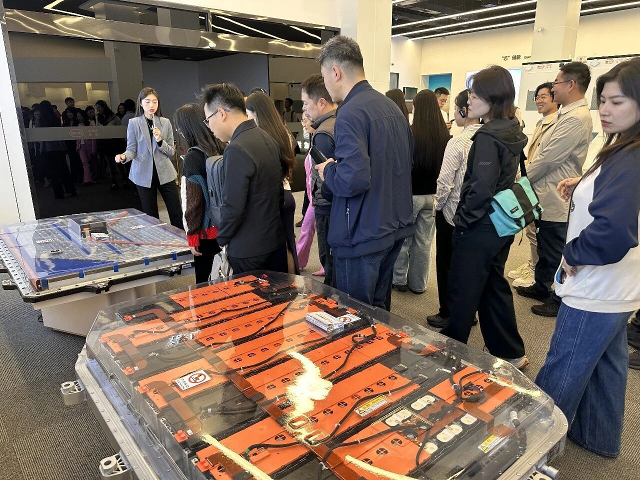 1月16日下午,研学团走进比亚迪股份有限公司(以下简称“比亚迪”)总部。师生们首先参观了比亚迪展厅,从新能源汽车、电池技术到轨道交通系统,全方位了解了比亚迪“为地球降温1℃”的企业愿景及其绿色科技产业布局。展厅内,王朝、海洋等系列车型展示了比亚迪在乘用车市场的多元化品牌战略;云轨、云巴等轨道交通模型,则体现出企业在城市立体交通领域的创新探索与实践。