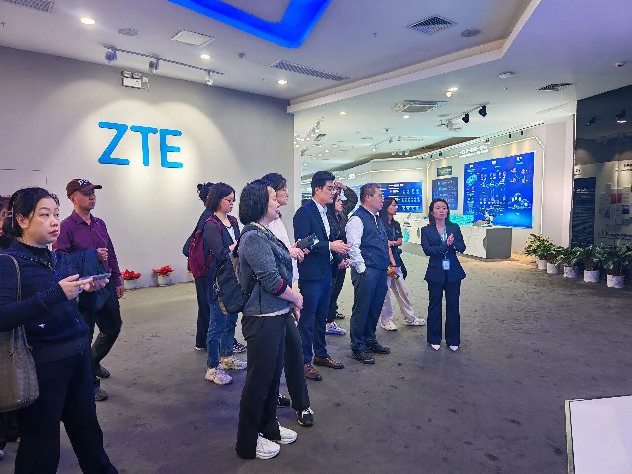 随后,师生们通过技术展示与案例讲解,系统了解了中兴通讯在5G基站核心芯片、全光网络解决方案等前沿领域的技术布局,并听取了中兴参与“东数西算”国家工程的算力支撑实践,以及其工业互联网平台在多个行业的落地应用。参观过程中,师生们深刻感受到这家通信巨头扎实的技术积淀与全面的产业赋能能力。