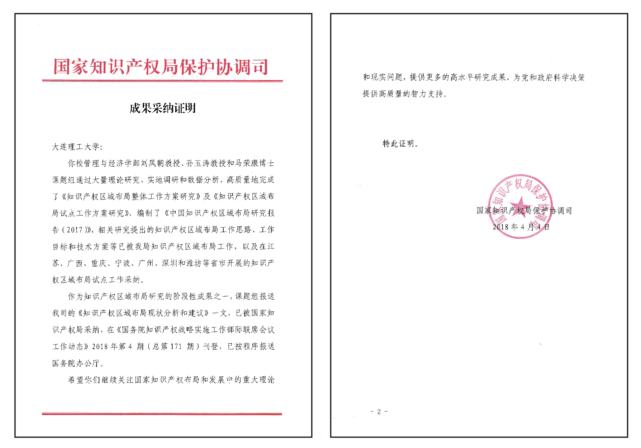 2018年3月7日,作为知识产权区域布局研究的阶段性成果之一,该研究团队报送国家知识产权局的《知识产权区域布局现状分析和建议》咨政报告,已被国家知识产权局采纳,在《国务院知识产权战略实施工作部际联席会议工作动态》2018年第4 期(总第171 期)刊登,已经按程序报送国务院。