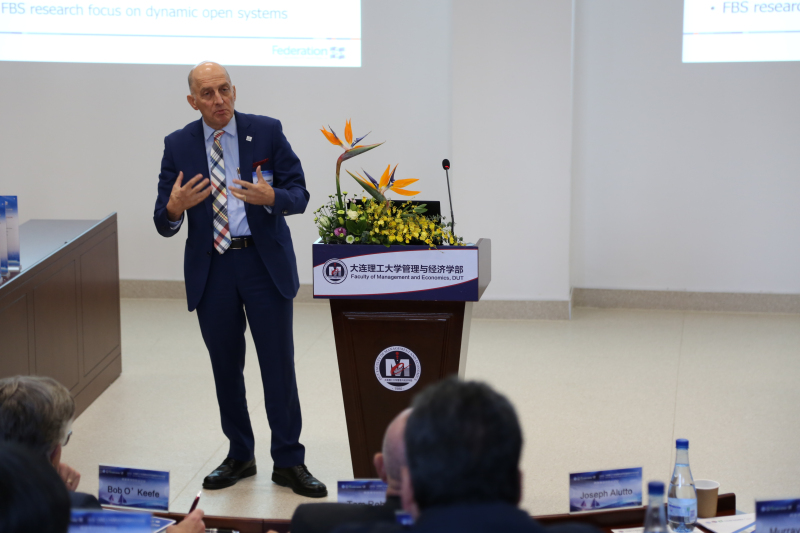 澳大利亚联邦大学商学院院长Jerry Courvisanos教授向大家介绍澳大利亚联邦商学院与大连理工大学管理与经济学部的深厚友谊以及悠久科研合作关系,介绍了两院师资科研、学生交流、合作研究等方面的情况,体现两院互惠互利、共同成长的发展关系。