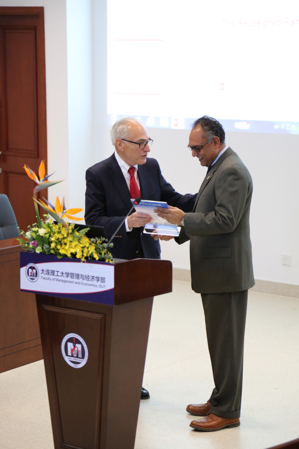图5:大连理工大学管理与经济学部国际咨询委员会主席Joseph Alutto先生为密歇根州立大学伊莱•博德商学院院长Sanjay Gupta教授颁发院长论坛感谢信。