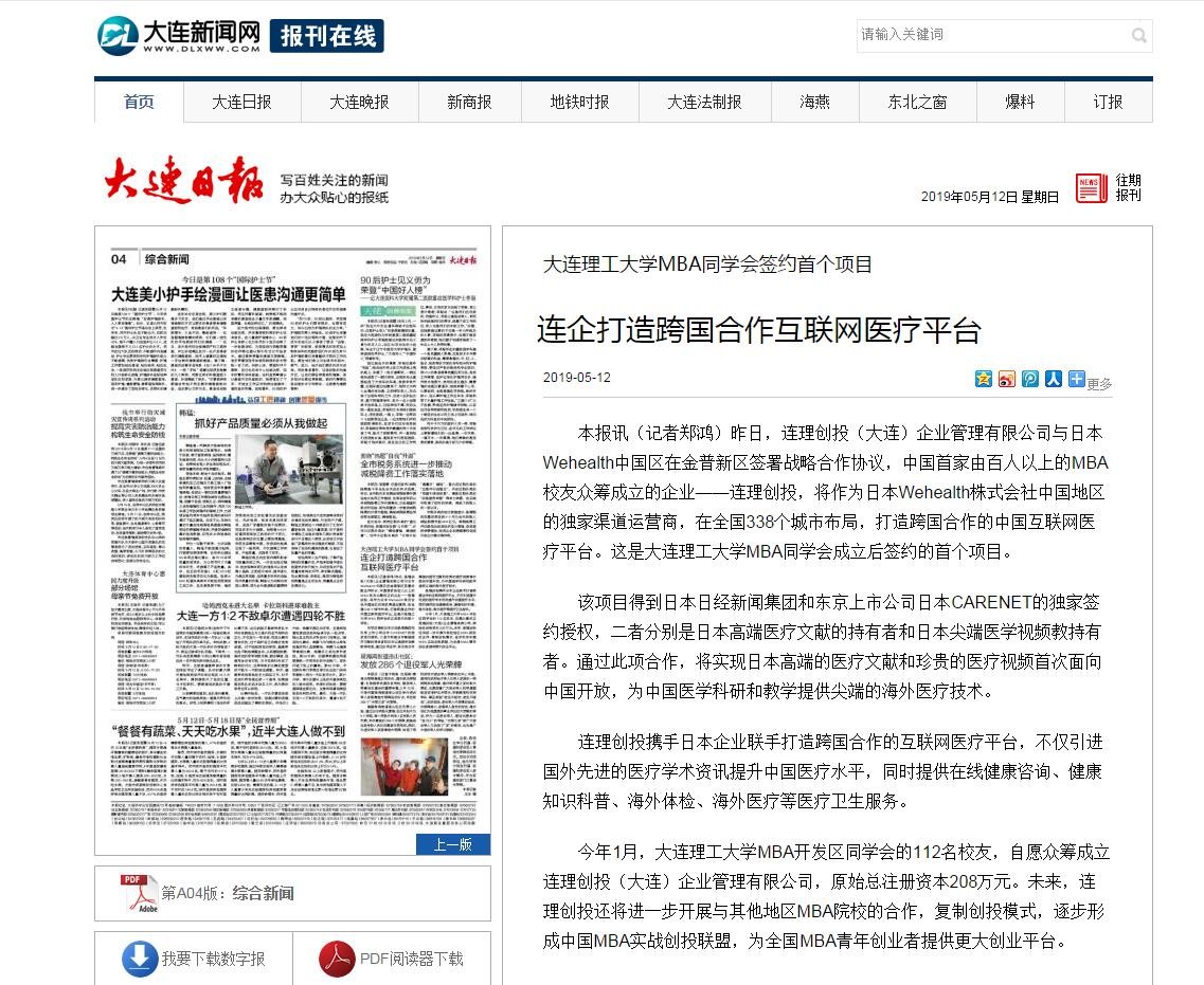 在国家大力提倡创新、创业、创优的背景下,今年1月12日,大连理工大学MBA开发区同学会的112名校友,自愿众筹成立了连理创投(大连)企业管理有限公司,原始总注册资本208万元。这些校友均供职于大连市各个大中型企业,从事市场开发、市场运营、项目管理、技术管理、人力资源、财务管理等岗位,拥有丰富的管理经验和人脉资源。连理创投成立以来,公司112 名股东群策群力,不断调整战略定位,扩大投资视野,放眼全球热点,寻找特色优质项目。经过充分的市场调研,连理创投选择了目前投资热点之一的“互联网+医疗健康”项目。经过历时近三个月的谈判,连理创投与日本 Wehealth 株式会社达成了合作意向,从三家渠道运营商中脱颖而出,成为日本 Wehealth 株式会社中国地区的独家渠道运营商。