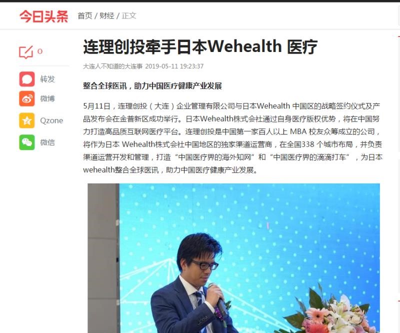 连理创投作为中国第一家百人以上 MBA 校友众筹成立的公司,成为日本 Wehealth株式会社中国地区的独家渠道运营商后,将在全国338 个城市布局,负责渠道运营开发和管理,打造“中国医疗界的海外知网”和“中国医疗界的滴滴打车”,为日本wehealth整合全球医讯,助力中国医疗健康产业发展。