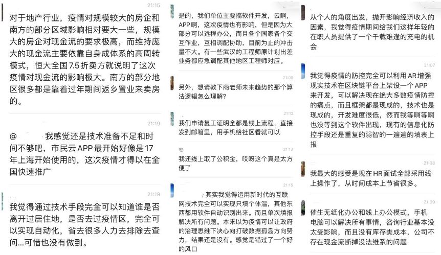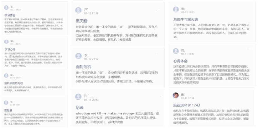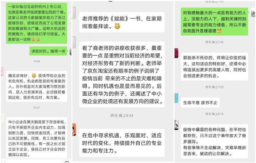 面对最新的论题、新的讲座形式,同学们表现出了空前的学习热情。虽然受疫情阻隔,同学们不能来到教室里学习交流,但是线上讲座最大限度地把身处全国各地的大工MBA同学和校友汇聚在一起。3月8日14:00,当线上讲座如约而至,第一时间登录观看的同学和校友达900余人,当天播放量达到近2000余次,累计访问量3800余次。同学们在学习之后通过平台、同学群及师生群展开了热烈讨论,节选部分如下: