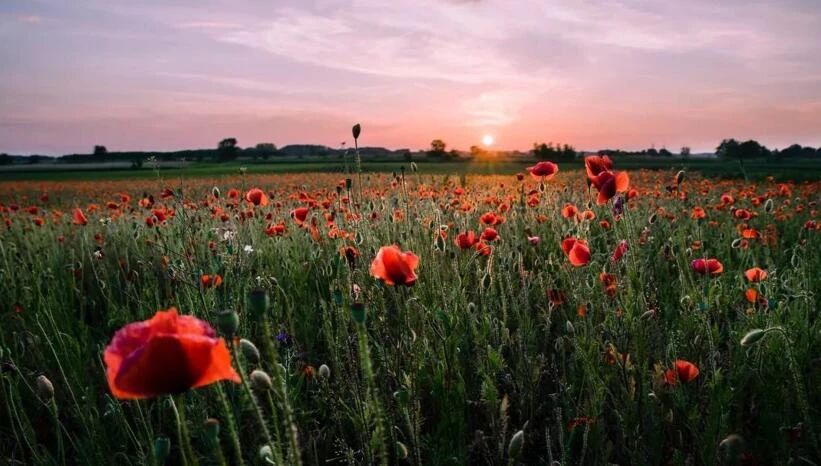 如果是在阳光灿烂的环境下拍摄时,则建议在早晨或黄昏时拍摄,此时可以利用天边常出现的朝霞或晚霞作为背景,可以选择长的变焦镜头,同时要站在花朵背光的位置进行拍摄,这样就可以拍下壮丽的背景光了。