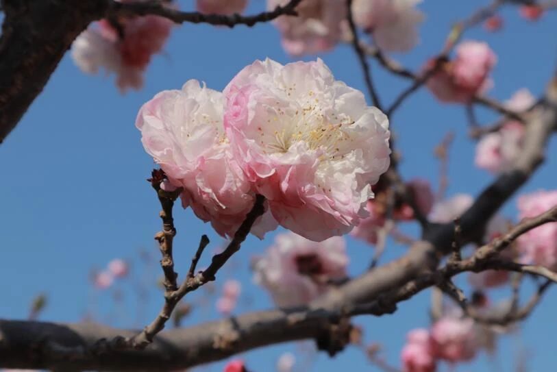 拱桥转角的樱花靓了晴空,候浮云密谈。
