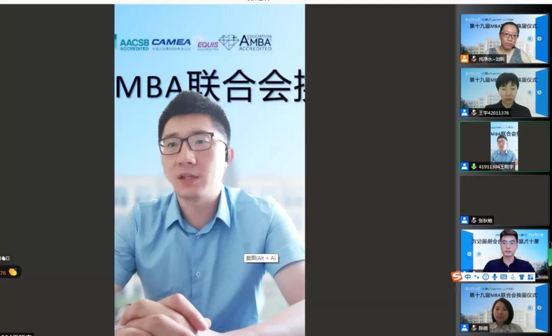 在刘昕老师公布第十九届MBA联合会成员名单后,大会举行了MBA联合会会旗交接仪式。线上师生共同见证了两届MBA联合会会旗的交接瞬间。相信第十九届MBA联合会接过会旗后,一定会继续乘风破浪、奋勇前行。