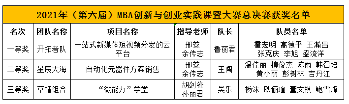 9月19日下午,历经6个多小时的创业项目展示,2021年(第六届)MBA创新与创业实践课暨大赛圆满落幕,比赛共决出冠军、亚军、季军各一名。