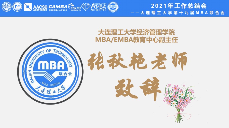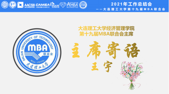 会议伊始,MBA/EMBA教育中心副主任张秋艳老师致辞,为大家介绍了大工MBA联合会的历史和作用,并对过去一年里联合会助力学院完成许多工作表达了赞扬和感谢,并为各位老师和联合会的同学们致以新春问候和祝福。随后,第十九届MBA联合会主席王宇对2021年联合会的工作进行了回顾,紧密围绕岗位职责和工作目标,对这一年来取得的成绩、存在的问题进行思考和总结,并在此基础上对接下来的工作做出规划和展望。最后对学院的大力支持,联合会各部门小伙伴的大力协助表示衷心的感谢。