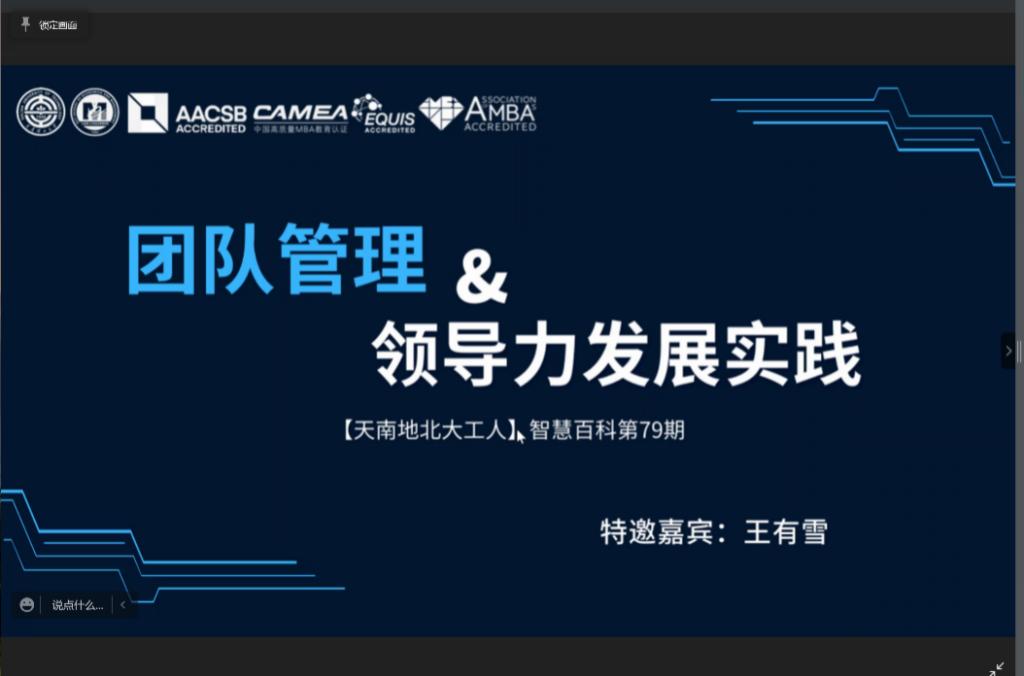 2022年4月9日晚,由大连理工第十九届联合会秘书处承办的“天南地北大工人”栏目在线上举办了智慧百科系列讲座活动,2020级EMBA学员王有雪为我们带来了以“团队管理与领导力发展实践”为主题的精彩讲座,共有251名同学相聚腾讯会议直播间,参与了此次活动。