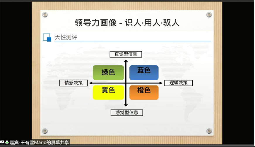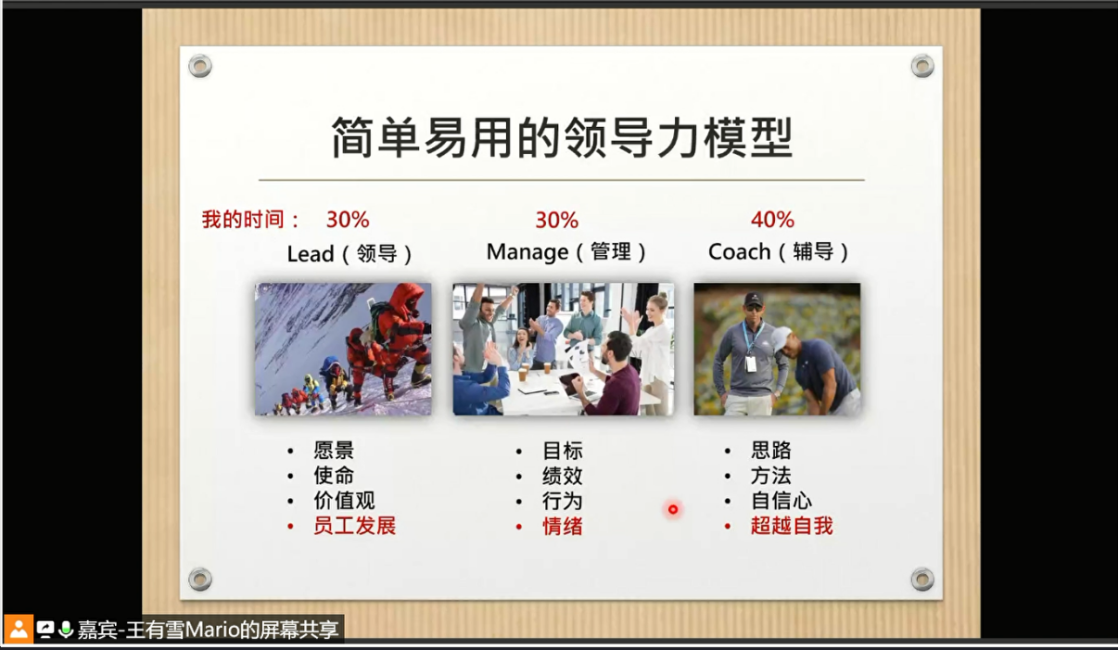 讲座主要分为三个部分,王有雪分别围绕 “好的Manager的识别与自我培养”、“领导力进阶”以及“职场性格颜色测试”进行了具体讲解和经验分享。