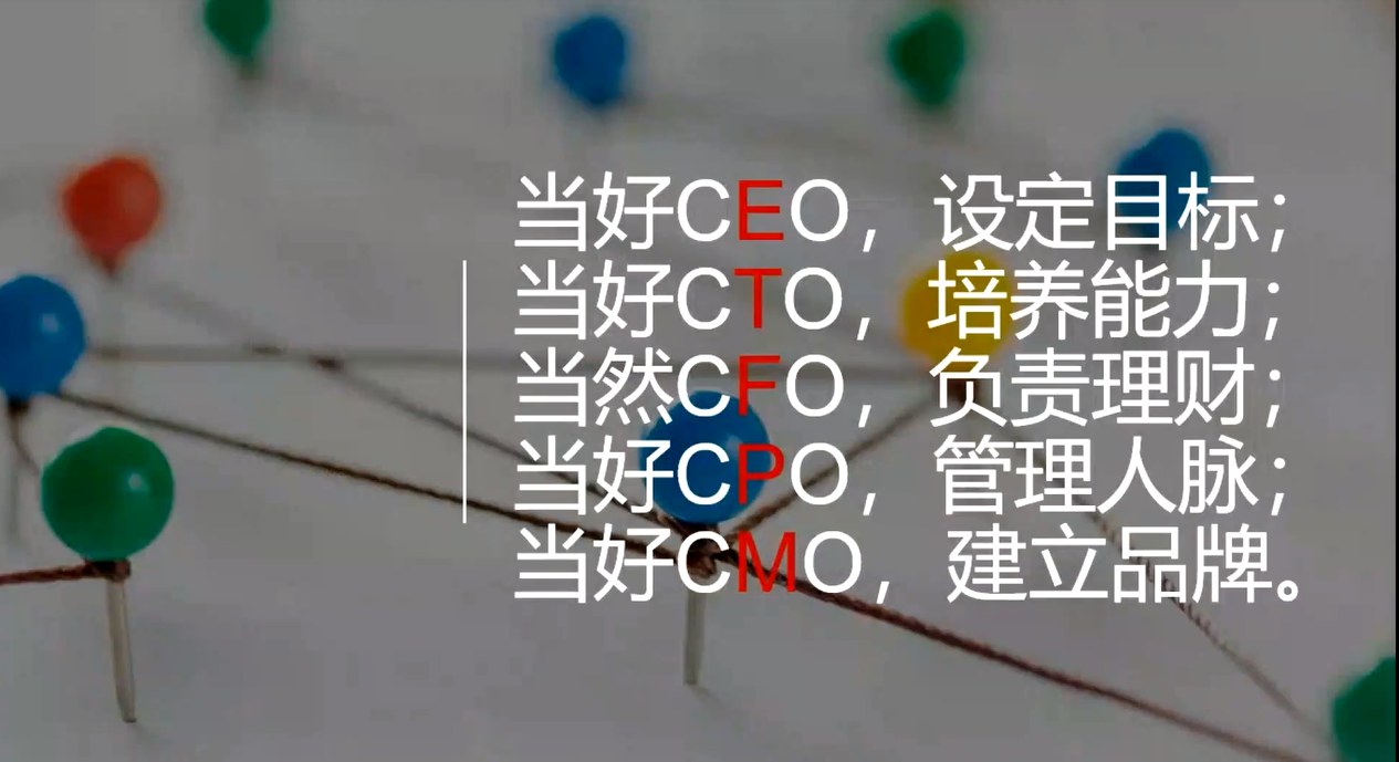 讲座中最精彩的部分莫过于高伟学姐与大家分享的“每个人的成长都是创业型公司的成长”这一新颖主题,深刻阐述了大家在进行职业规划时可以把自己当做一家创业型公司来经营的观点,可以通过利用OKR目标设定、记账APP、优势测评等工具,不断进行自我精进,领导好自己,聚焦到自己。做到 “五个当好”——分别是“当好CEO,设定目标;当好CTO,培养能力;当好CFO,负责理财;当好CPO,管理人脉;当好CMO,建立品牌”最终成为自己的企业家,做到自己的最好。