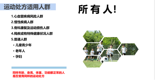 运动处方是指由运动处方师根据需求者的特定目的、健康信息、医学检查、运动风险筛查、体质测试结果,以规定运动频率、强度、时间、方式、总运动量以及进阶,制定的目的明确、系统化、个体化健康促进、健身及疾病防治的运动指导具体方案。运动处方的目标是根据患者的具体需求和个人兴趣,将能够激发需求者依从性的运动原理和行为学技巧相融合,从而实现患者的目标。