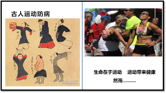 祖国医学关于运动健身的记载悠久,公元前3000年,阴康氏发明一种舞蹈来缓解关节病痛,运动成为康复手段。公元前239年的《吕氏春秋》提出“动以养生”的观念。名医华佗(约145-208年)的“五禽戏”、隋代太医巢元方(公元605-616年)编著的《诸病源候论》中的运动疗法,都为“运动是良医”奠定了基础。运动是良医、生命在于运动、运动带来健康,当然运动也有风险,运动最大的风险就是:不去运动。