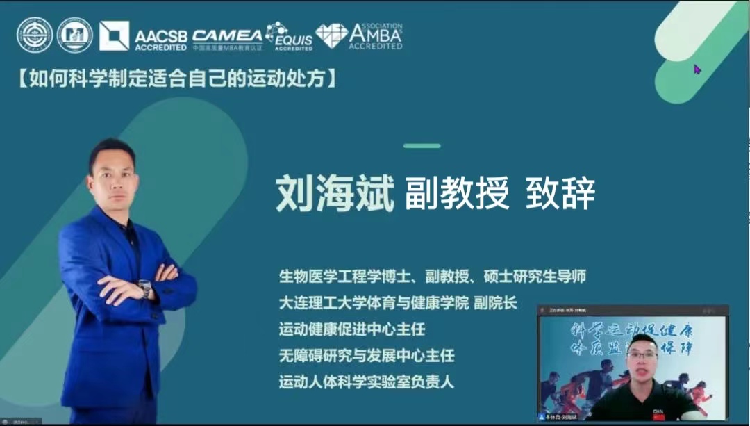2022年5月7日晚,由大连理工大学第十九届MBA联合会秘书处承办的智慧百科“天南地北大工人”系列讲座活动在线上举行。东海潮教授为我们带来了以“如何科学制定适合自己的运动处方”为主题的精彩讲座,共有100余名同学相聚腾讯会议直播间,参与了此次活动。
