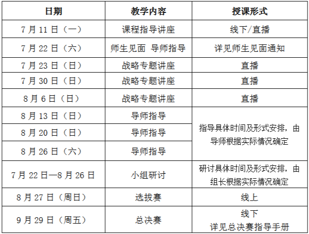 全部课程分为课程指导讲座、战略专题讲座、导师指导、小组研讨、选拔赛和总决赛六个部分。通过模拟现实的商业案例,训练新生在面临挑战时的决策和分析能力,培养理性的商业思维能力,搭建理论和实际相结合的践行良机。通过团队协作,呈现精彩案例分析,形成极具实战意义的企业咨询方案。对学生后续课程学习,无论是学习方法,还是思维维度都有很大的帮助。指导教师负责培训全过程,启发并指导学生自主完成案例分析各环节工作。
